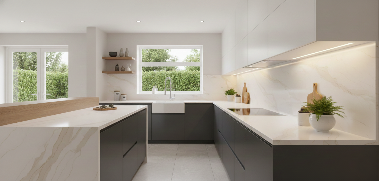 1. Bàn bếp: mặt bàn tủ, mặt bàn làm việc, ốp tường bếp, vv